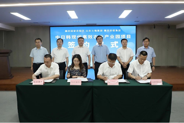 8月24日下午,中日韓現(xiàn)代高效農(nóng)業(yè)產(chǎn)業(yè)園國際高端果蔬種植基地項目簽約儀式在濰坊國家農(nóng)綜區(qū)總部基地舉行。濰坊國家農(nóng)綜區(qū)推進辦常務(wù)副主任,濰坊經(jīng)濟開發(fā)區(qū)(農(nóng)綜區(qū)核心區(qū))黨工委副書記、管委會主任喬日升;山東省土地發(fā)展集團威海有限公司董事長、總經(jīng)理李強,濰坊有限公司董事長、總經(jīng)理鄭偉;濰坊農(nóng)創(chuàng)集團黨委書記、董事長王保梁出席簽約儀式并致辭。濰坊農(nóng)創(chuàng)集團黨委副書記、總經(jīng)理付華東主持簽約儀式。