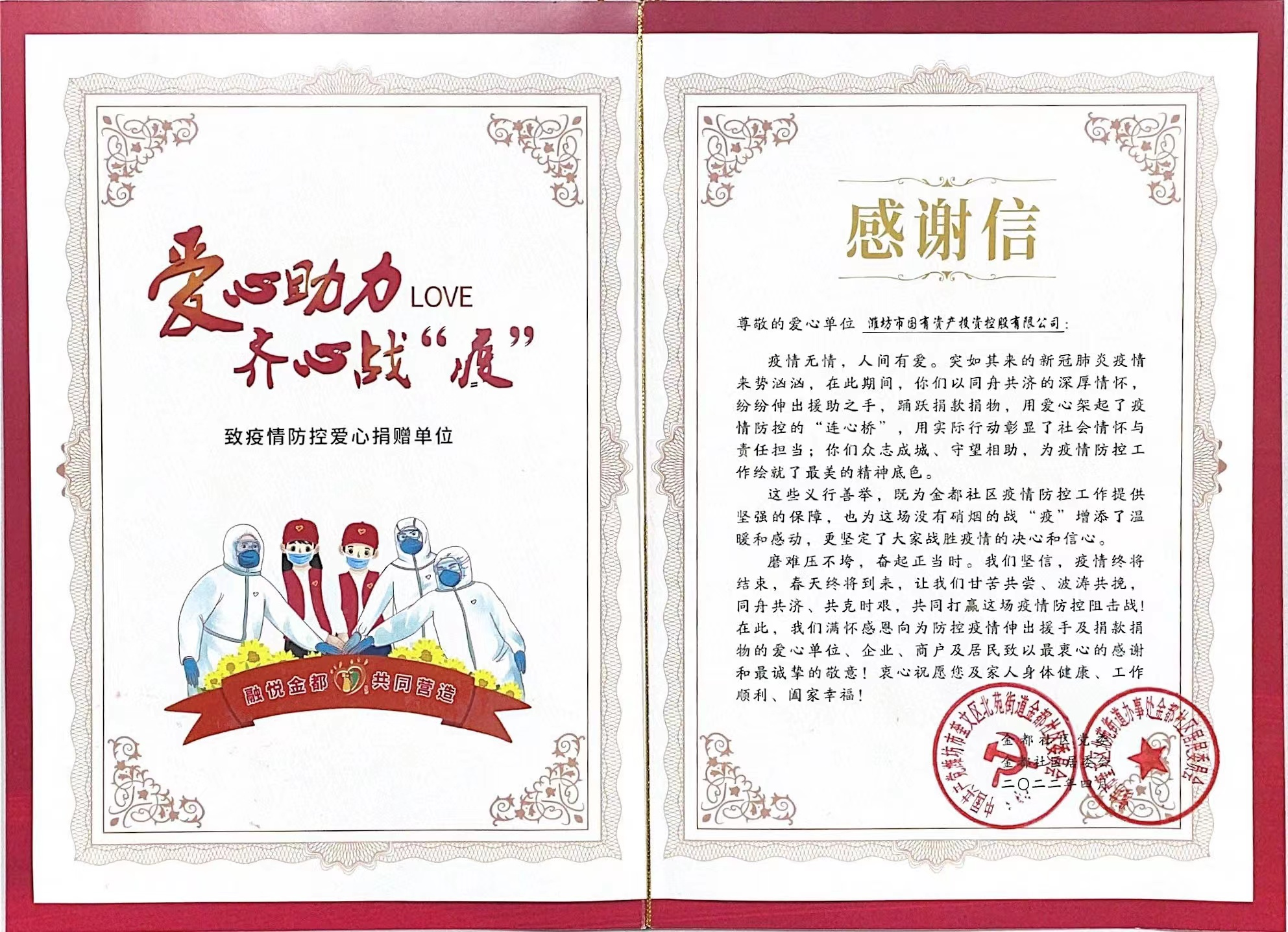 5月7日,市國投公司收到了一封來自金都社區的感謝信,信中對市國投公司第一時間馳援社區疫情防控工作,積極協調捐贈抗疫物資等志愿行動表達了衷心的感謝。截至目前,公司向社區捐贈醫用口罩、酒精、醫用手套、方便面等抗疫物資價值6000余元,前后5次通過電聯、...