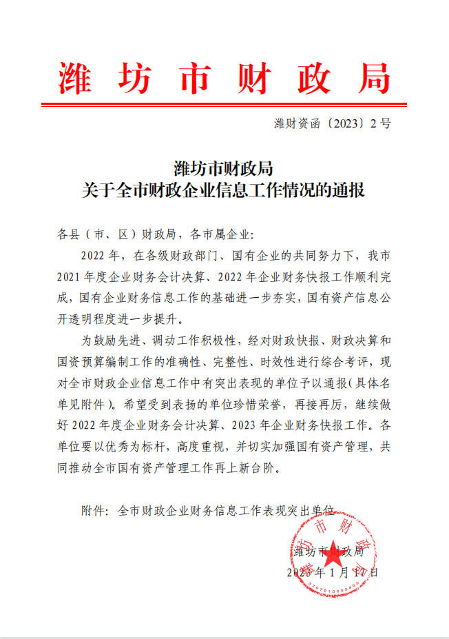 近日,濰坊市財政局下發(fā)文件,對全市財政企業(yè)信息工作情況進行通報,我公司榜上有名,連續(xù)兩年被評為“全市財政企業(yè)財務信息工作表現(xiàn)突出單位”。公司歷來高度重視財務管理工作。2022年度一把手親自抓靠,通過會計工作數字化轉型、人才隊伍結構優(yōu)化、會計職能